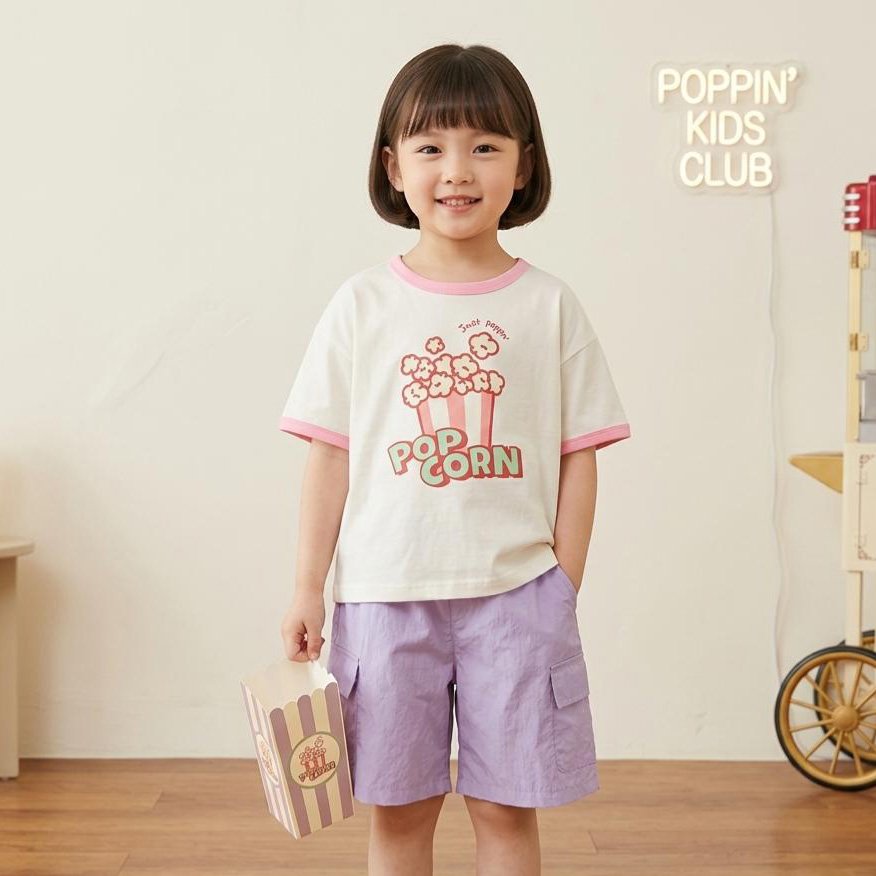 趣味爆谷印花: 上衣胸前印有搶眼可愛的 Popcorn 爆谷圖案,設計充滿童趣,為夏日造型增添亮點。