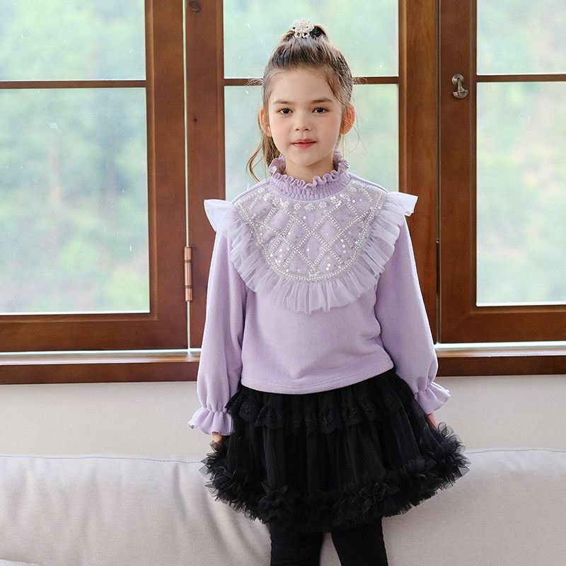 韓版中領珠片蕾絲邊保暖絨上衣